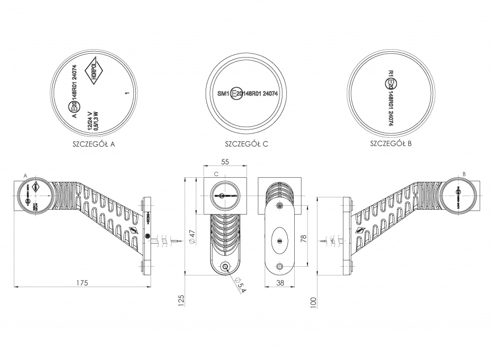 LD 2174/GRAPHITE ir trīskārts sānu marķējuma lukturis uz diagonāla, gara stiprinājuma, paredzēts uzstādīšanai transportlīdzekļa labajā un kreisajā pusē.