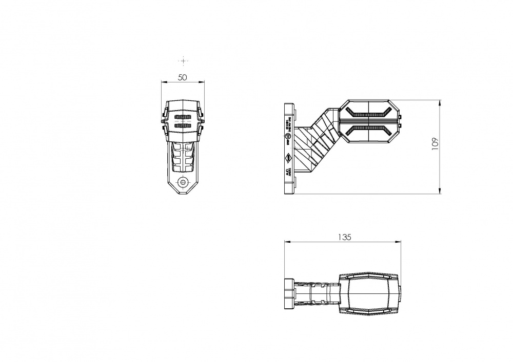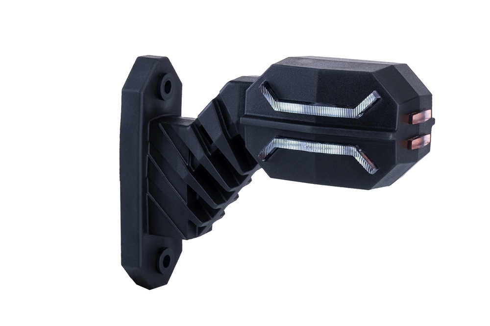 Trīsfunkcionāls marķējuma lukturis uz gara diagonāla stiprinājuma, paredzēts uzstādīšanai transportlīdzekļa kreisajā pusē.