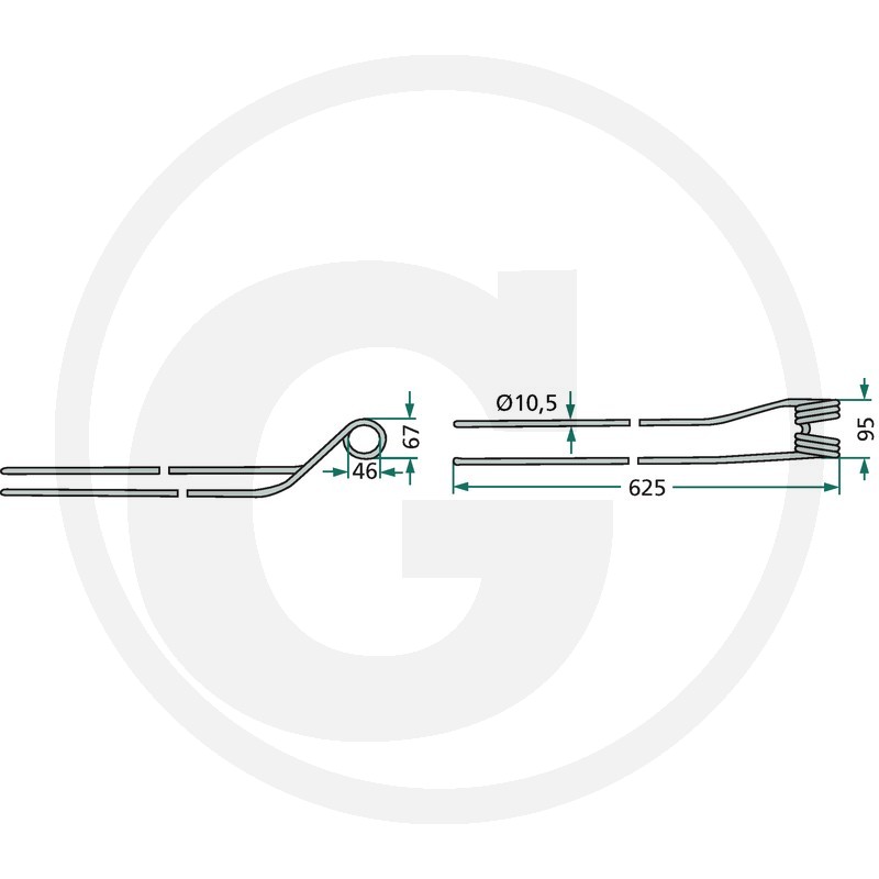 Rotējošā grābekļa zars, 625x95 Ø10,5 mm, labā puse iekšpuse